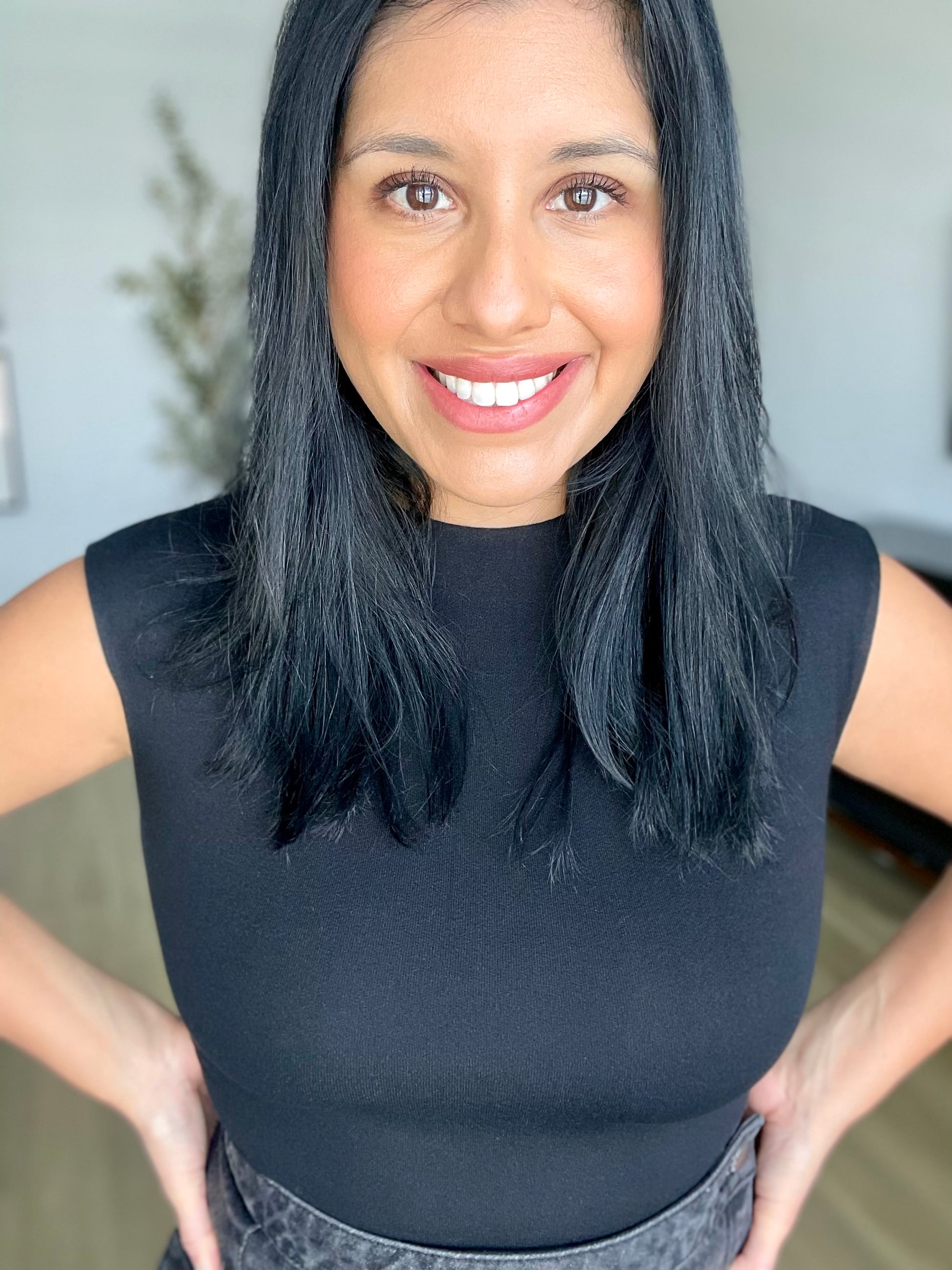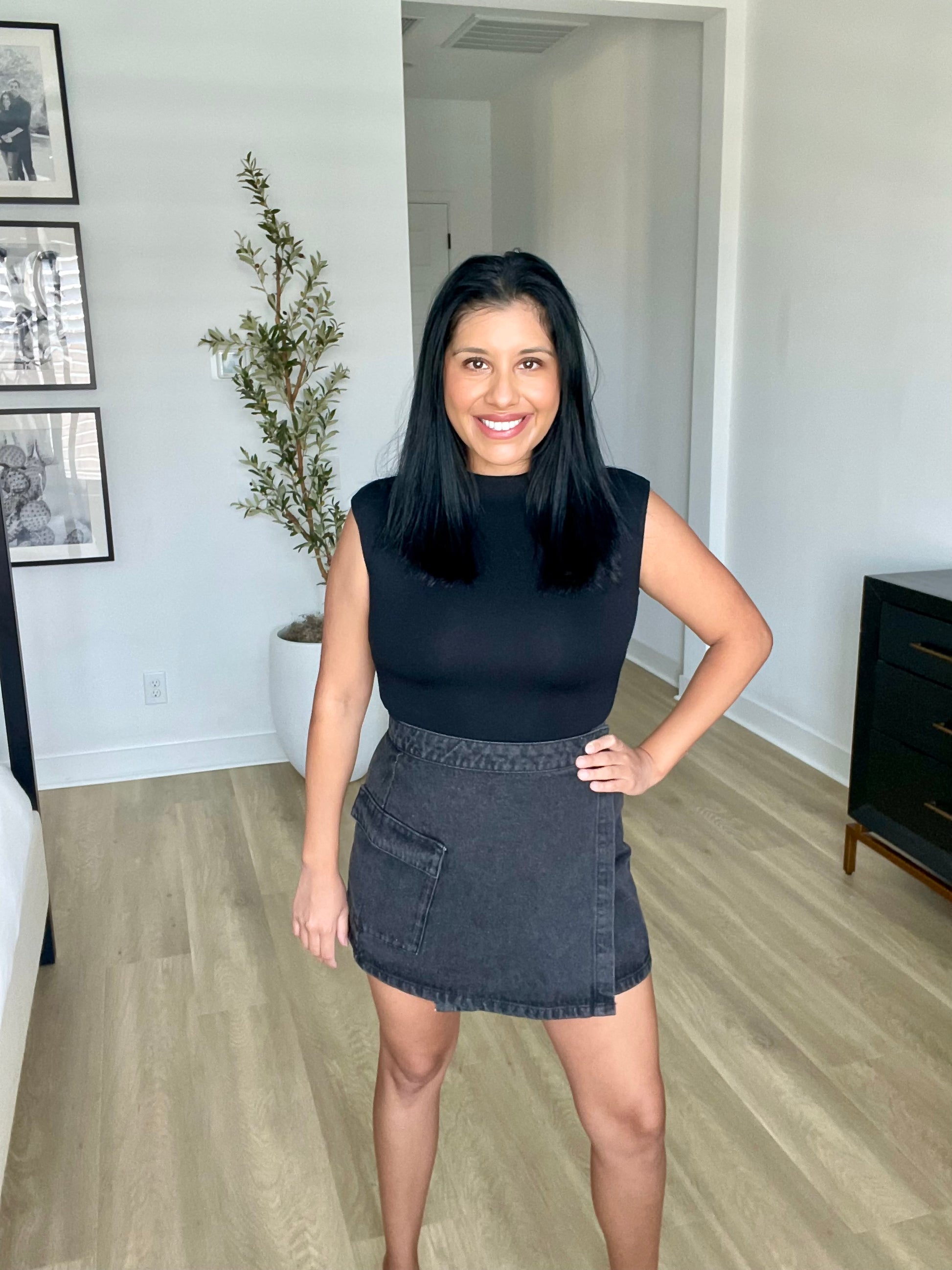 The most perfect bodysuit! It is so flattering with cinched sides, a high neck, and cap sleeves.