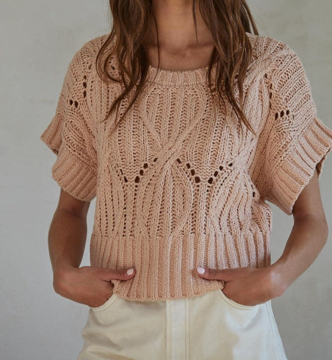 Dusty pink knit sweater with a crochet design, featuring a round neck and short sleeves.
